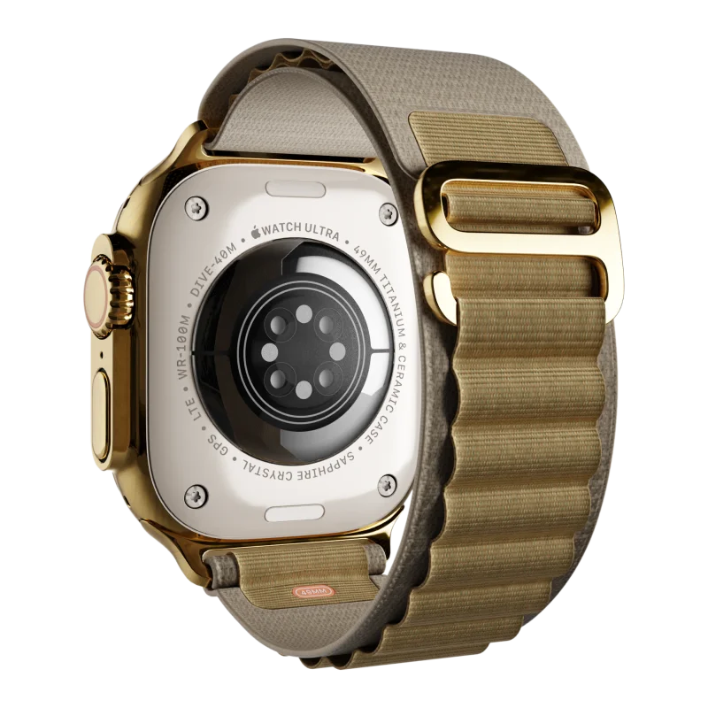 Designed for both performance and style, this 24k Gold smartwatch is ideal for adventurers who appreciate the finer things in life. Make a unique statement with this exclusive gold Apple Watch Ultra, crafted for the bold and style-conscious.